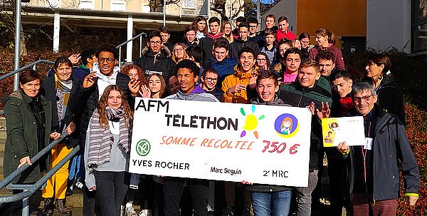 Cette année encore, les élèves des deux classes de 2ndes MRC ont relevé le défi de collecter des fonds au profit du Téléthon. Pari gagné puisque un chèque de 750€ a était remis à M.Chavanon président de l’association départementale de l’AFM. Ce don fut possible grâce au partenariat fait avec la boutique Y.Rocher de la ville d’Annonay.
