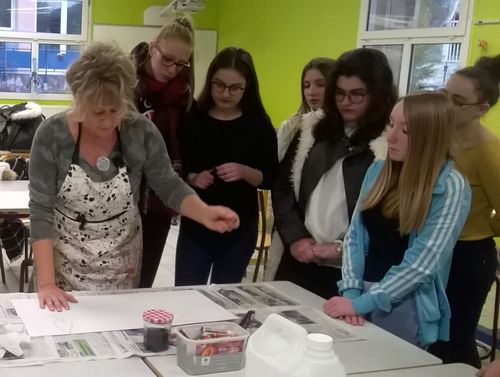 C’est à ce moment qu’Agnès Veyre-Serre, artiste plasticienne locale, est venu animer les ateliers d’illustration du conte. Grâce à son dynamisme, sa bonne humeur et son professionnalisme, Agnès a permis aux élèves de découvrir des techniques très différentes, dont la peinture au brou de noix qui a eu beaucoup de succès… Chaque groupe a ainsi réalisé 6 à 8 planches d’illustrations.
